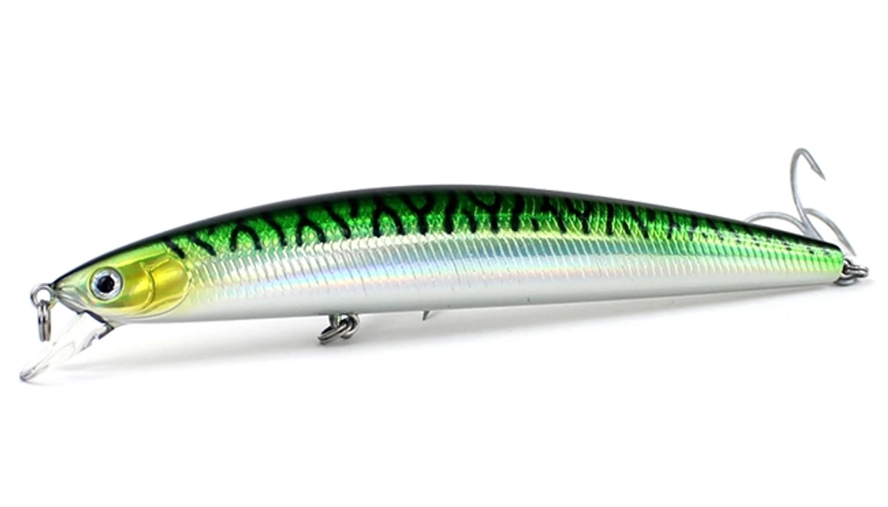 The Daiwa SP Salt Pro Minnow is a large baitfish style saltwater plug featuring a swimming action that appeals to vicious predatory species of game fish. The SP Minnow is known among saltwater enthusiasts as one of those lures that just catches fish – many types of fish. Daiwa’s Salt Pro Minnow is versatile in how it can be retrieved, most anglers opt for a variation of a straight, steady motion with sporadic rips of the rod’s tip to trigger instinctual feeding by gamefish. This long casting bait is also suitable for for a fast, ripping style retrieve that produces an erratic side-to-side swimming action to draw predator’s attention. Features weight transfer system for easier, longer casts; realistic scale pattern and 3-D eyes; heavy duty saltwater hooks.