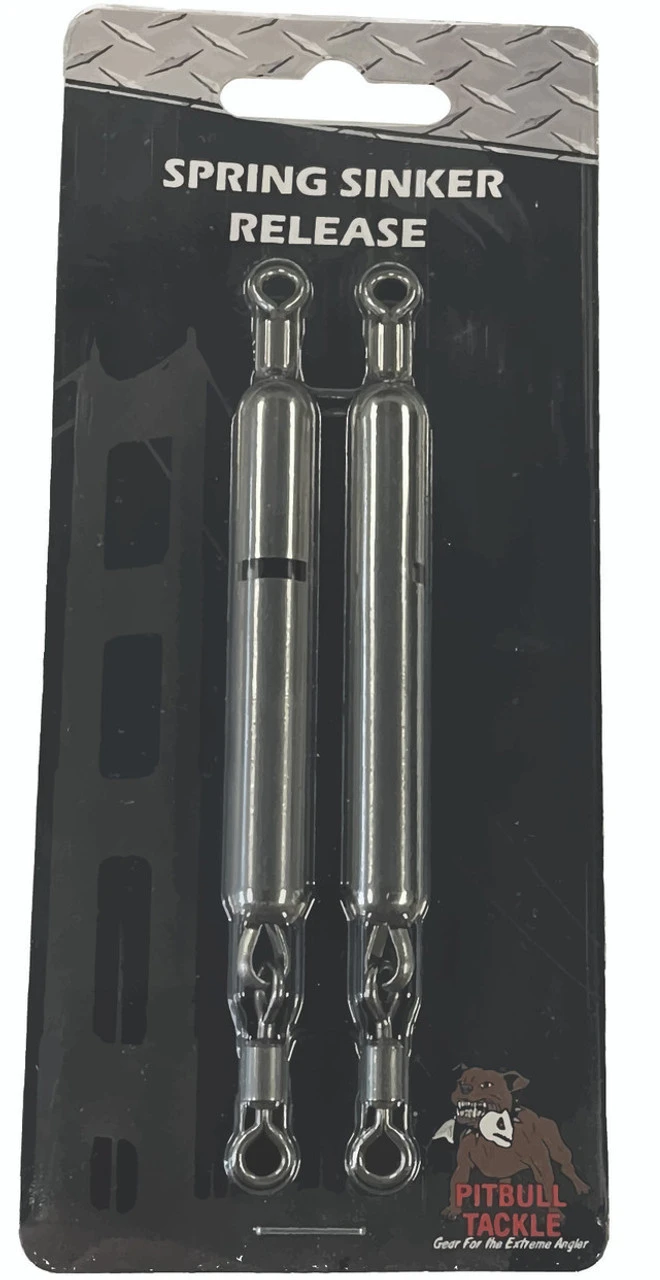 The Pitbull Tackle Salmon Trolling Sinker Release is a 100% stainless steel weight release mechanism made popular along the California Coast. The spring loaded pin inside the chamber can be pulled up and down to insert the eye of your preferred lead cannonball weight. When the release is used while trolling and a fish pulls on the lure behind the release the spring will condense and release the lead cannonball allowing you to fight the fish directly. The spring tension was meticulously calibrated to ensure the weight is released on the fish worth keeping while also strong enough to keep the weight from dropping on a small undersized catch. The spring, pin, frame, and swivels are all constructed of stainless steel to ensure a quality product trip after trip.