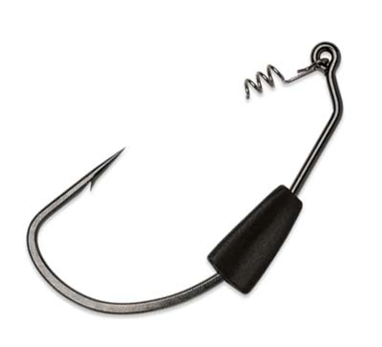 The “Ike Approved” series of hooks from VMC were designed with he help of 2003 Bassmaster Classic Champion Mike Iaconelli. The Heavy Duty Weighted Swimbait Hooks were designed to be an all-around soft plastic swimbait hook ideal for sparse cover and open water alike. The screw in bait holder designed affords weedless rigging for use in grass, wood or around other obstructions. These type of hooks are most commonly used for the 4-6″ soft plastic swimbaits, both hollow or full body, which come without any sort of internal rigging. The hooks are constructed from black nickel and exhibit an extra wide gap design. The spring bait keeper enables anglers to quickly and easily switch baits without damaging the plastic and will extend the life of the bait exponentially. The belly weighted shank maintains the weedlessness of the swimbait while enabling it to be fished in deeper water or fished with a quicker pace up shallow when fish are more active. We offer the VMC “Ike Approved” Heavy Duty Weighted Swimbait Hooks in six hook/weight variations – see chart below for options. Each pack contains 4 hooks.